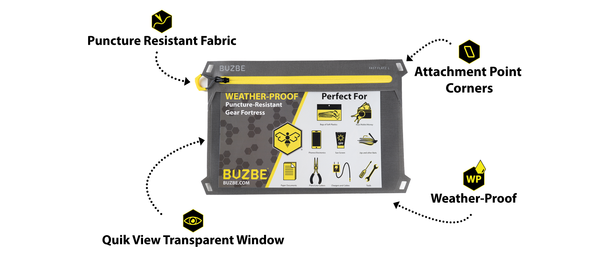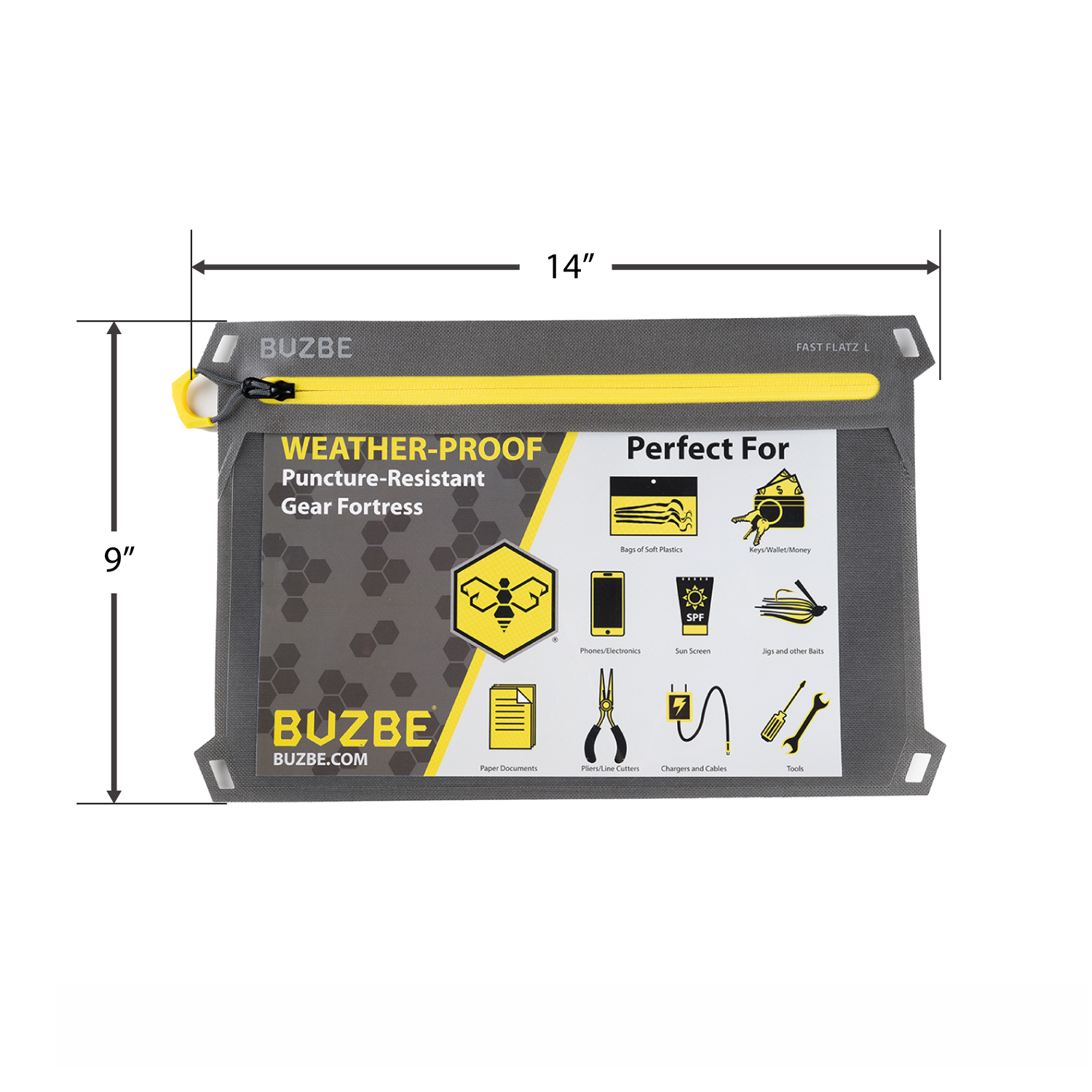 The BUZBE Fast Flatz™ were designed to bring functional organization and protection with ease of access. The Fast Flatz™ pouch is a weather-proof puncture-resistant gear fortress. Easily view the contents through a transparent window for ultimate organization and saving time. The BUZBE Fast Flatz™ are perfect for storing packs of soft plastics, large offshore lures, tools, or any personal items you wish to keep safe such as phones or wallets. Available in five different sizes.