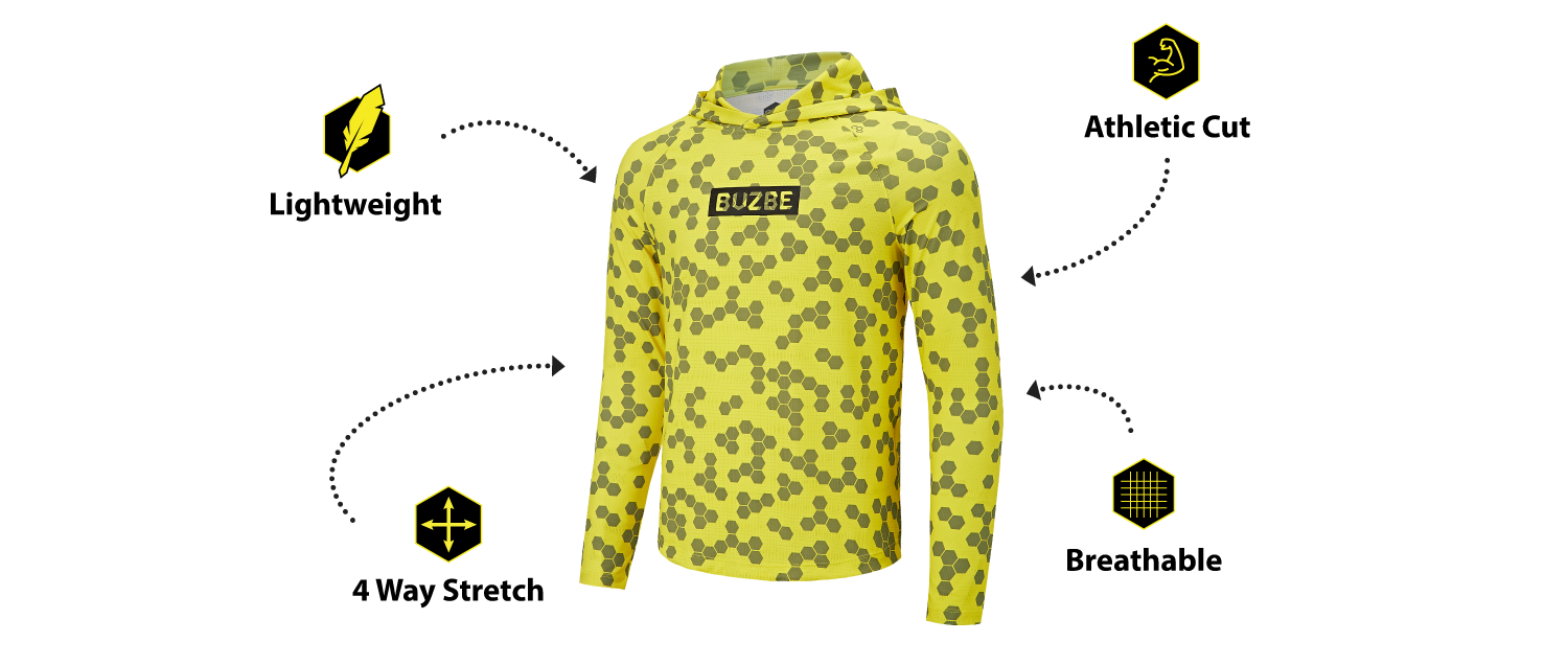 As expected from BUZBE, this performance hoodie is top quality, over-engineered, and keeps you dry and cool out on the water. Made from only the highest quality materials, a lightweight quik-dry performance fabric with vent holes keeps you cool. The lightweight hood helps to protect from the sun.